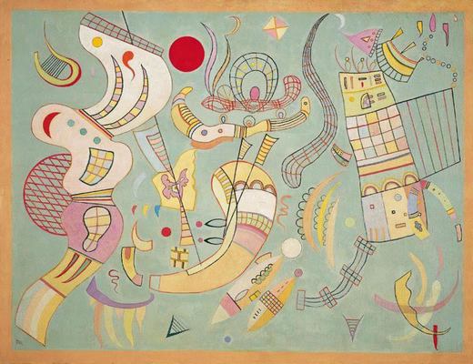 واسیلی کاندینسکی نقّاش و نظریه‌پرداز روسی بود. در سی‌ سالگی شغل مشاوره‌ی حقوقی را‌‌ رها می‌کند و راهی مونیخ می‌شود تا در رشته‌ی نقاشی (از جمله نزد فرانتس فُن اِشتوک) هنرآموزی کند. کاندینسکی را از پیشگامان بزرگ هنر انتزاعی به شمار می‌آورند. او بر این عقیده بود که آنچه در هنر مهم است، نه عنصر «فرمال» بلکه انگیزه‌ای باطنی (محتوا) است که عامل قطعی تعیین‌کننده‌ی فرم است. او به وجود نیروی باطنی ناشناخته‌ای در وجود هنرمند باور داشت که از آن با عنوان «ارتعاش‌های جان» یاد می‌کرد. او بر این عقیده بود که این نیرو در اختیار ما نیست، بلکه ما در اختیار اوییم. هنر کاندینسکی استوار است بر تباین‌های تجسمی، کنار هم نهادن سطوح، نقطه‌ها و خط‌ها، عناصر افقی و عمودی و اریب، منحنی‌‌ها و زوایا، نرمی و زبری، تکرار موزون و تک‌ْرخداد‌ها، بزرگی و کوچکی و جز این‌ها، نوعی توالی مداوم از تنش‌های بصری پدید می‌آورند که باید خنثی شوند. اجزای گسسته و کل‌های پیوسته، تنش و رهش، سرانجام در قالب یک کلّ تصویری متعادل جمع می‌آیند. کاندینسکی همواره به توصیه‌ی گوگن درباره‌ی کاربردِ رازگونه‌ی رنگ‌ اعتقاد داشت. او ایجاد هماهنگی را نامناسب‌ترین چیز برای زمانه‌اش می‌دانست.
